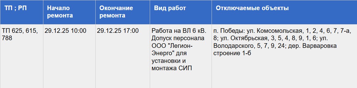 Публикуем график проведения работ и список адресов, жители которых временно останутся без электроснабжения: