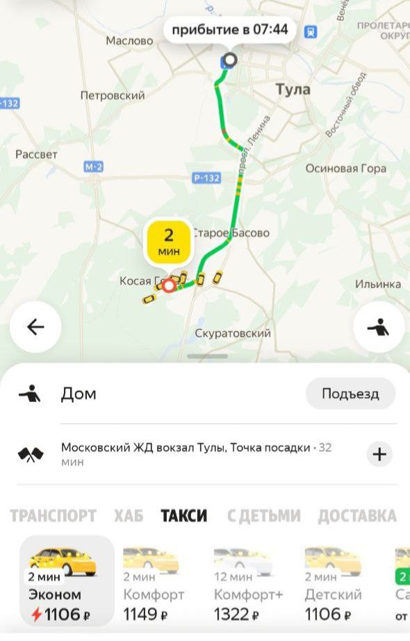 К примеру, поездка от Косой Горы до Московского ж/д вокзала (протяженность около двух километров) стоит в районе 1300 рублей. Самый дешевый вариант стоил 1106 рублей. Стоимость увеличивается по мере класса автомобиля.