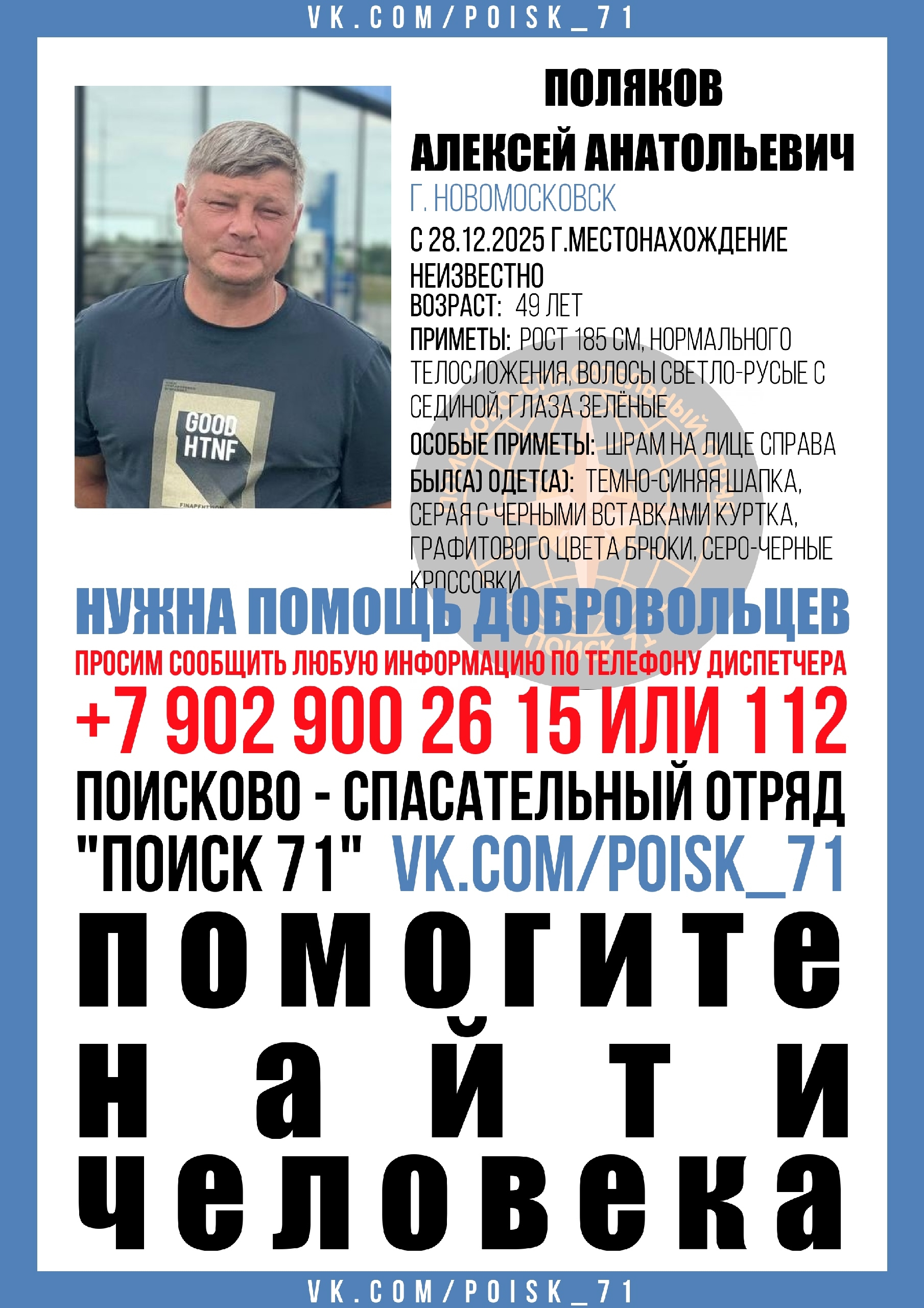 В Новомосковске разыскивают 49-летнего Алексея Анатольевича Полякова. Об этом сообщает поисково-спасательный отряд "Поиск 71".