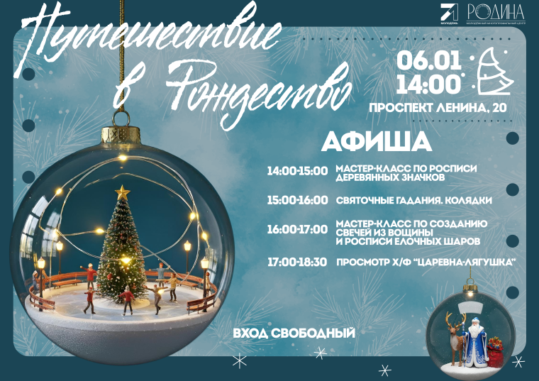Молодёжный центр «Родина» приглашает всех желающих на праздничную программу «Путешествие в Рождество». Информация появилась на официальном сайте администрации города Тулы.