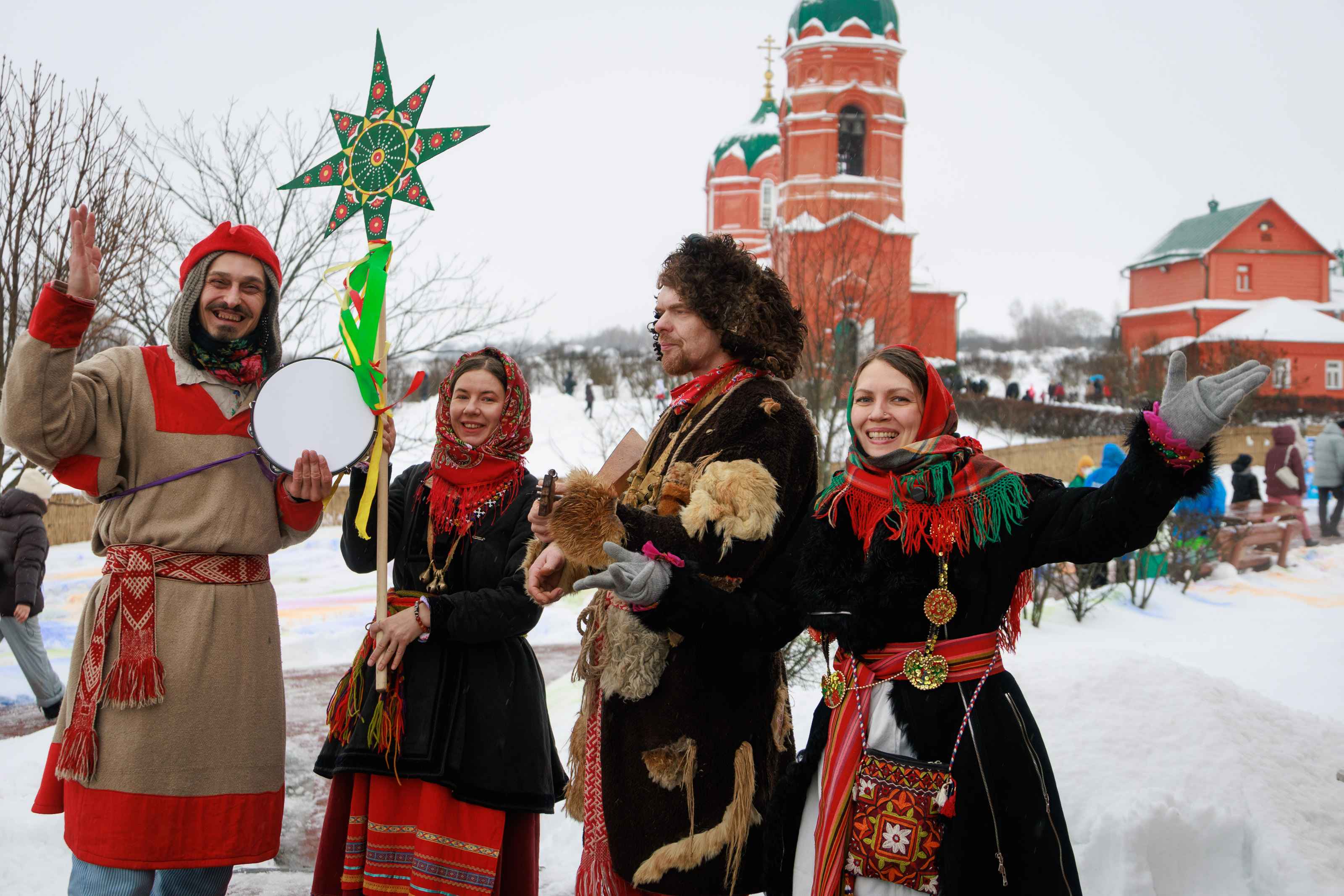Отрадно отметить, что известная московская творческая команда «Звери, птицы, скоморохи» тоже приняла участие в мероприятии. Артисты показали публике зрелищные ритуалы и обычаи русской старины, традиционно исполняемые в Святки. Их приезд в село Монастырщино не редкость: зрители хорошо знают ансамбль по ежегодному летнему празднику «Сено-солома». Фестиваль погружал зрителей в мир древних традиций ряженых святок, символически воссоздавая шествия с горящей звездой, символизирующей визит мудрецов с дарами к младенцу Иисусу.
