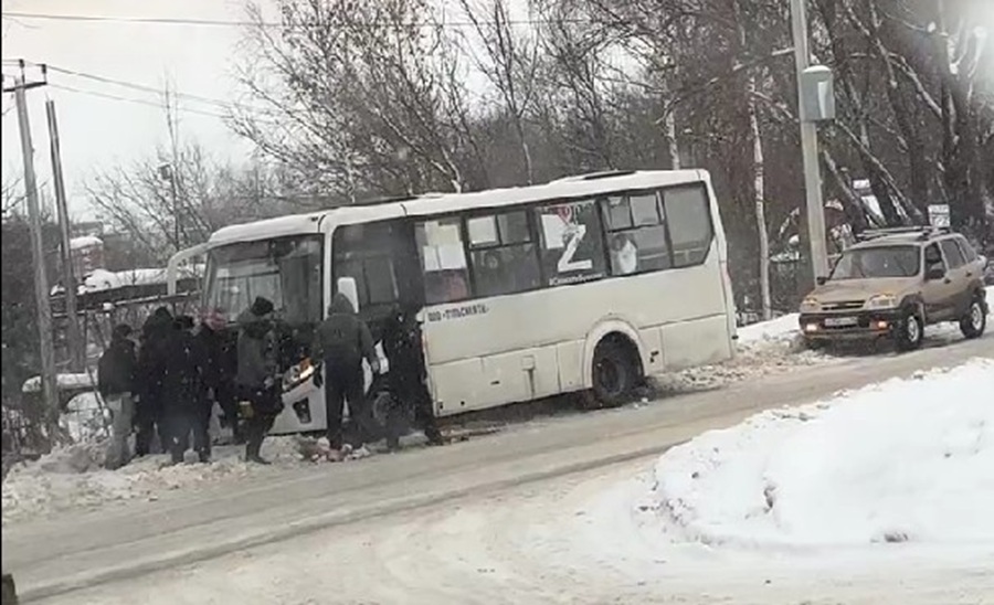 Автобус съехал с дороги и застрял в сугробе 10 января около 15-30. Пассажиры вышли из транспорта и стали вытаскивать его из "плена".
