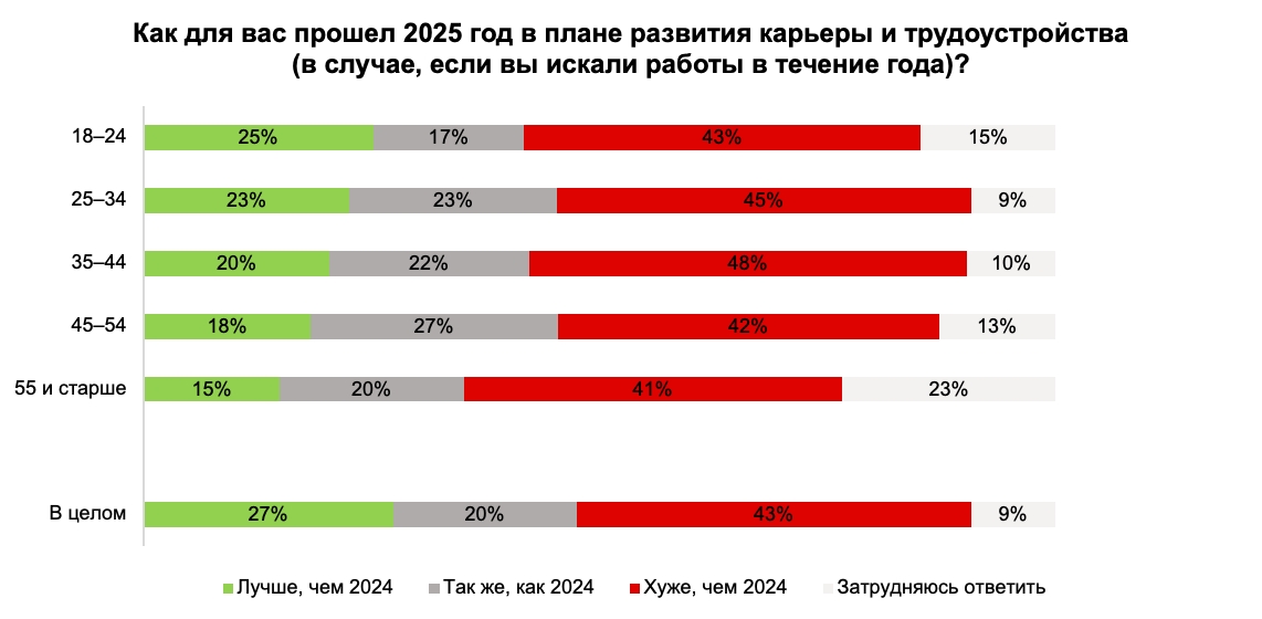 Негативную оценку чаще дают россияне в возрасте 35-44 года (48% из них считают, что в плане развития карьеры год проходит хуже) и 25-34 лет (45%).