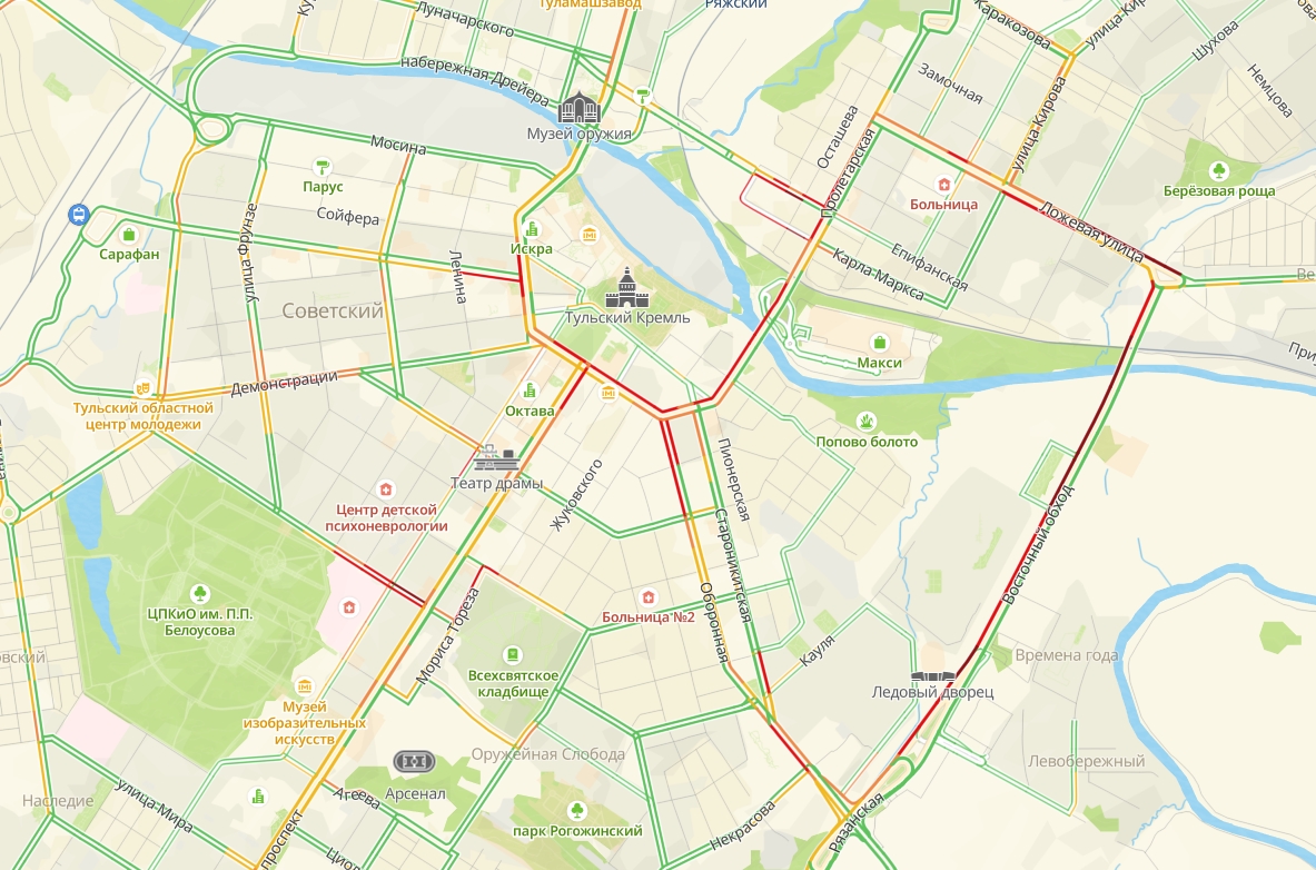 Самые большие пробки в настоящее время собрались на улицах Октябрьской, Советской, Ложевой и Первомайской, а также на Восточном обводе, Веневском шоссе и проспекте Ленина. Заторы в городе оцениваются в 6 баллов.