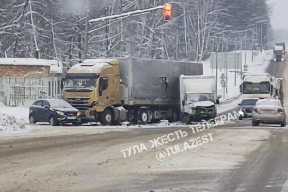 Фура, "Газель" и легковушка столкнулись в районе Богучарово в Тульской области. Кадры с места аварии в соцсетях публикуют очевидцы.
