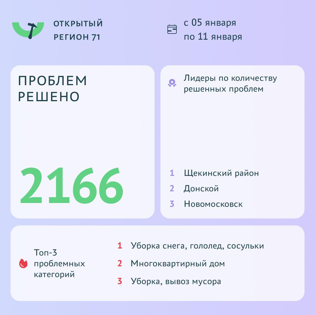 В период с 5 по 11 января с помощью портала "Открытый регион 71" решили 2 166 проблемы. Об этом сообщает Министерство цифрового развития и связи Тульской области.