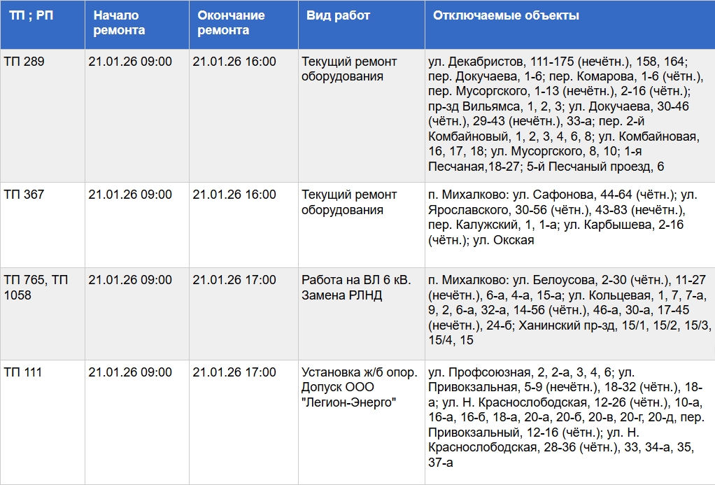 Публикуем график проведения работ и список адресов, жители которых временно останутся без электричества: