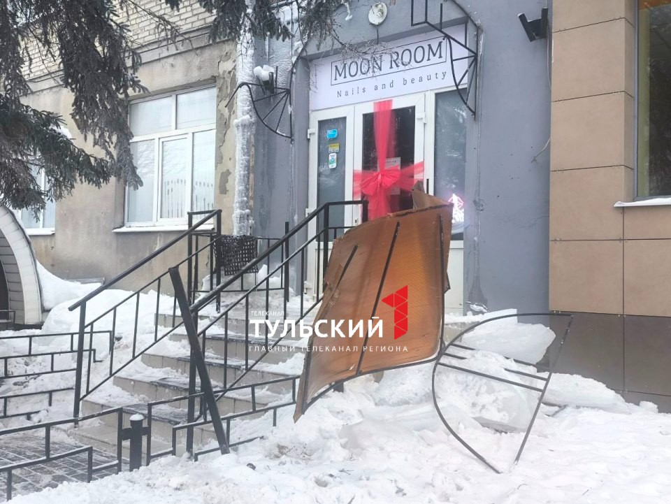Сосульки сбили козырек салона красоты в Туле. Об этом сообщает корреспондент телеканала «Первый Тульский».