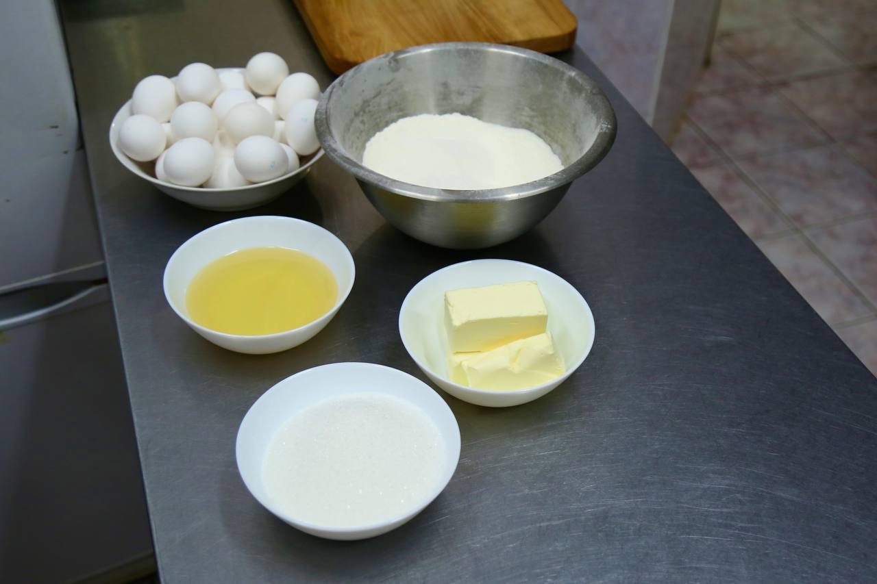 Итак, в состав коржа входят: мука, яйца, сахар, разрыхлитель, ванильный сахар и крахмал. Яйца и сахар взбивают до пышной массы - относительно изначальной она должна подняться в 2-3 раза. Муку – заранее просеивают с разрыхлителем, ванильным сахаром и крахмалом и засыпают в полученную массу до консистенции слегка густой сметаны.