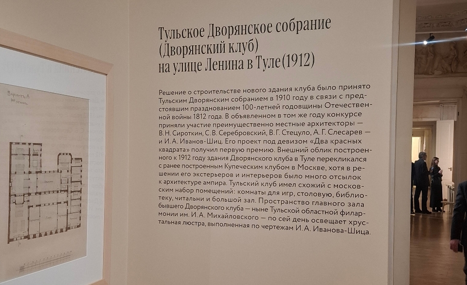 В Государственном музее архитектуры имени Щусева в Москве открылась первая монографическая выставка зодчего Иллариона Иванова-Шица, где представлен проект Тульского дворянского собрания. Об этом сообщили в пресс-службе областной филармонии.