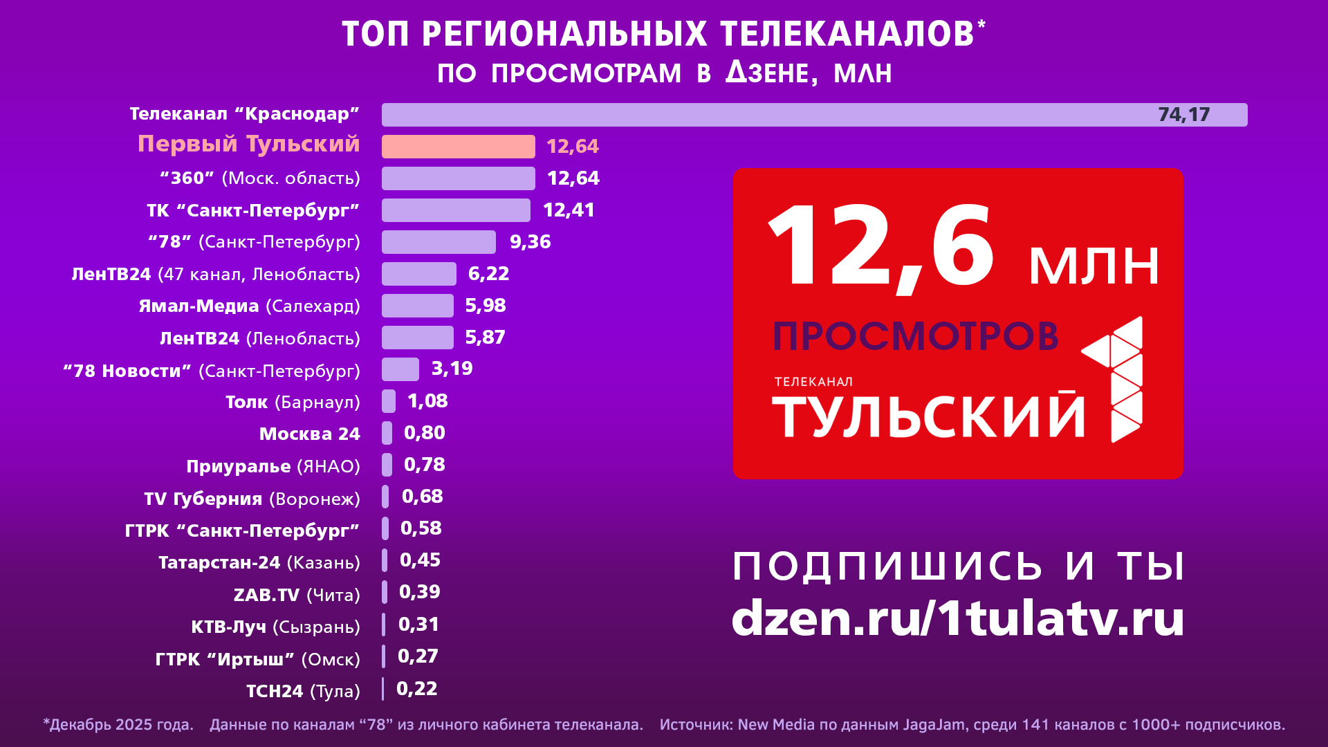 Телеканал "Первый Тульский" занял второе место в стране среди всех региональных телеканалов по просмотрам в Дзене. В декабре 2025 года мы собрали больше 12,6 миллиона просмотров.