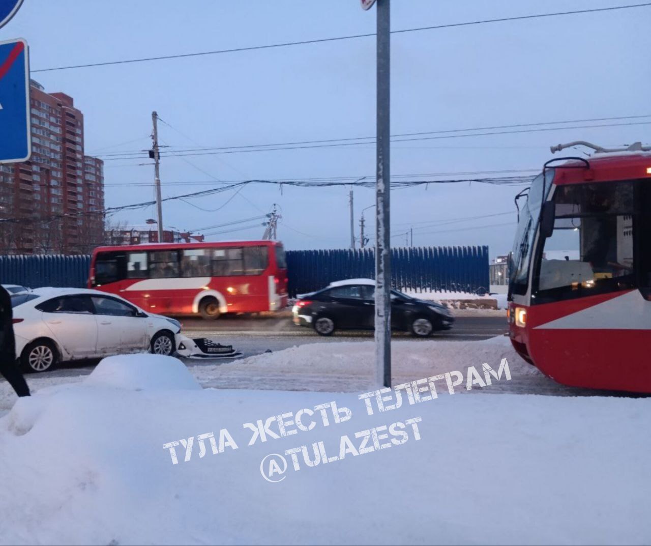На улице Николая Руднева (пересечение с проспектом Ленина) трамвай столкнулся с легковым автомобилем. На фотографии видно, что автомобиль сильно пострадал.