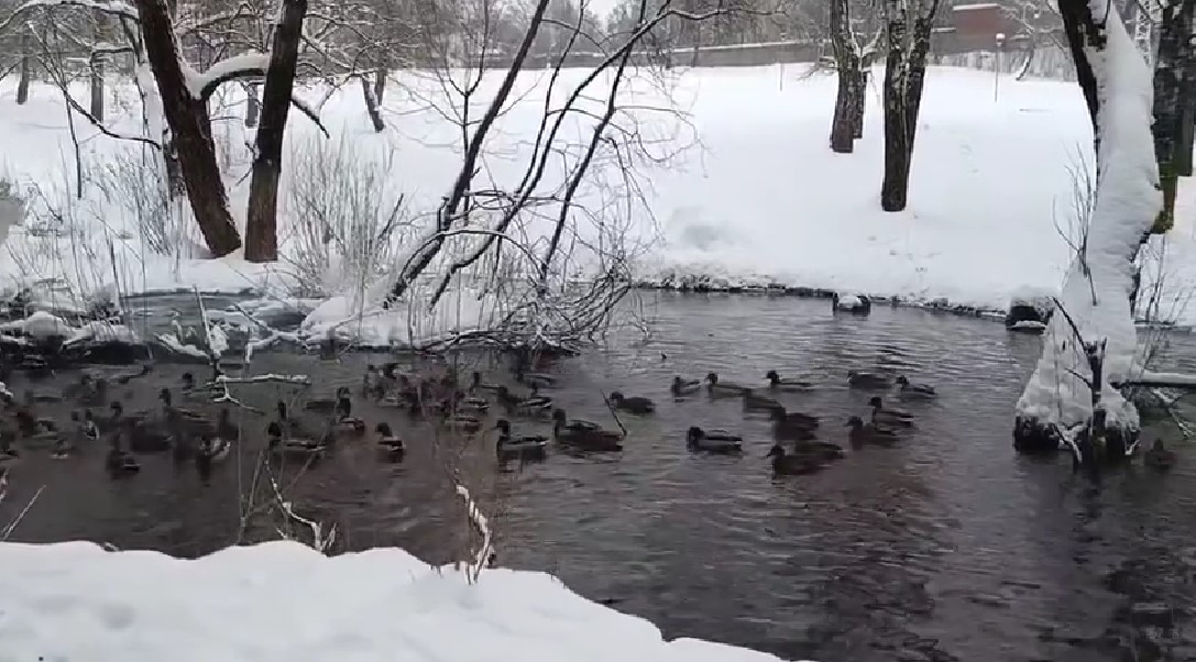 Водоем в Рогожинском парке в основном покрыт льдом, но имеется незамерзающий участок с достаточно быстрым течением воды.