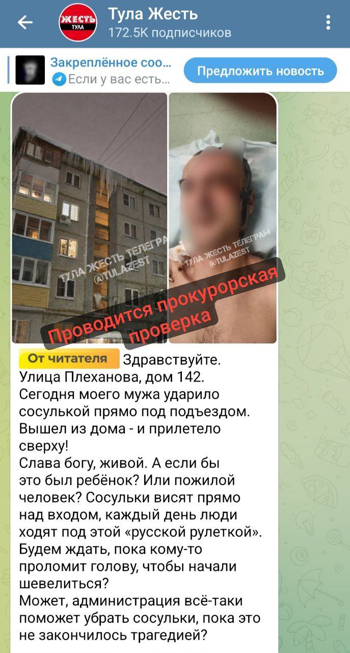 В местном телеграм-канале пользовательница опубликовала новость о том, что на ее мужа с крыши упала сосулька. Инцидент якобы произошел 2 февраля во дворе дома № 142 на улице Плеханова.