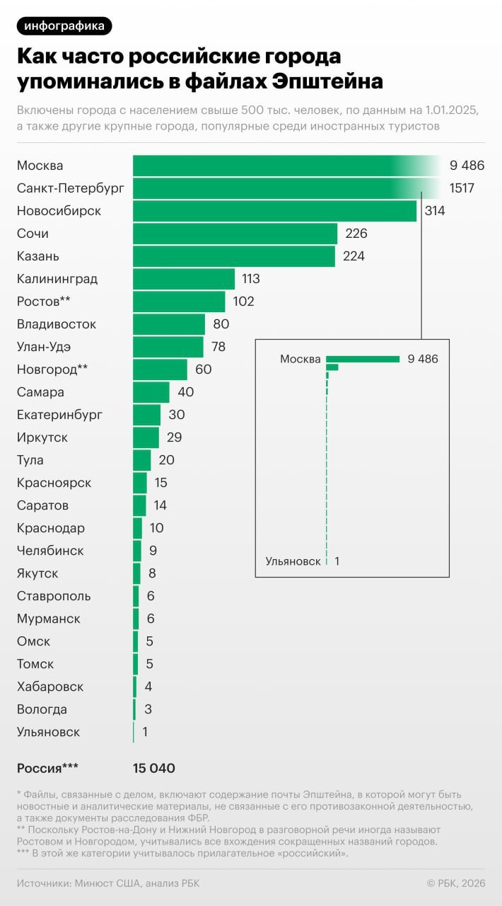 Всего в скандальных файлах обнаружили больше 15 тысяч упоминаний российских городов. Чаще всего в материалах дела фигурируют Москва (9 486 раз), Санкт-Петербург (1517), Новосибирск (314), Сочи (226) и Казань (224).