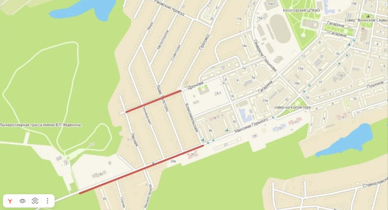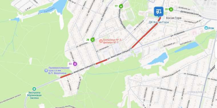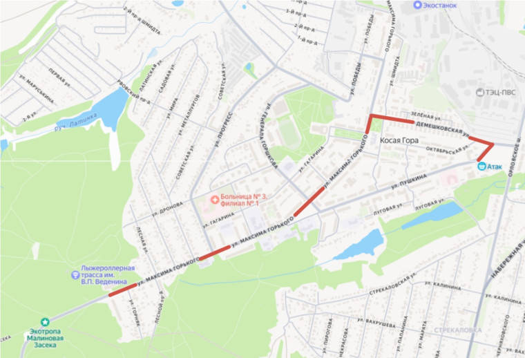 2) Косая Гора, ул. М. Горького, 14 (ост. ДК «Косая Гора») – ул. Максима Горького – лыжероллерный центр «Веденино».