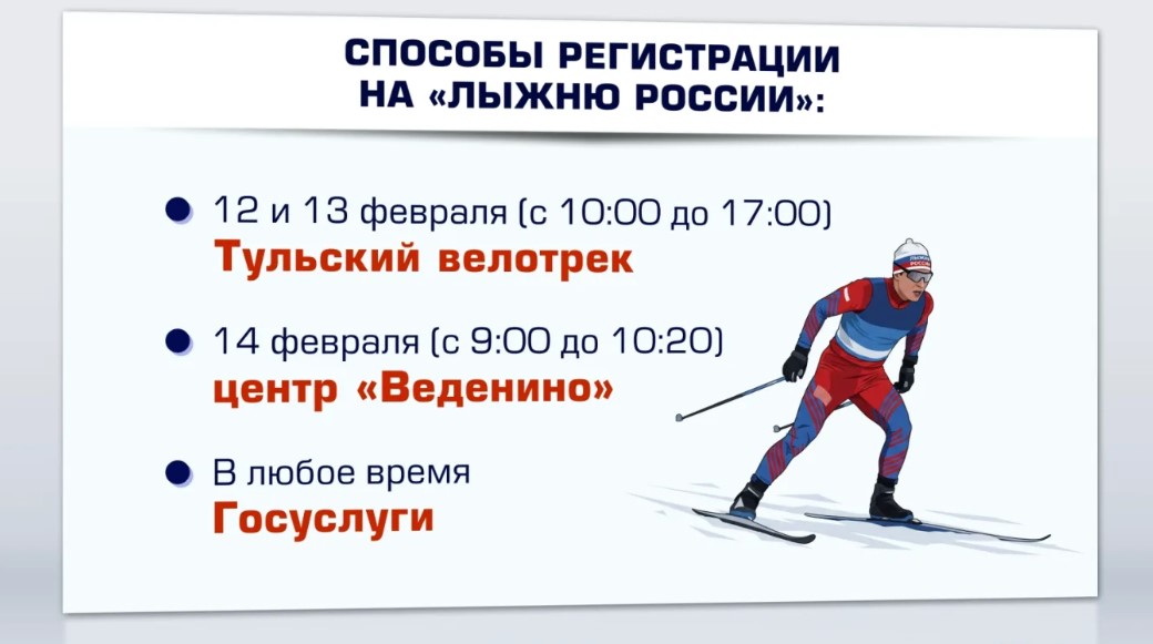 Записаться можно и очно. 12 и 13 февраля с 10 часов утра до пяти вечера заявки будут принимать в конференц-зале Тульского велотрека. А в день гонки - 14 февраля с 9-00 до 10-20 зарегистрироваться можно будет прямо в лыжероллерном центре "Веденино".