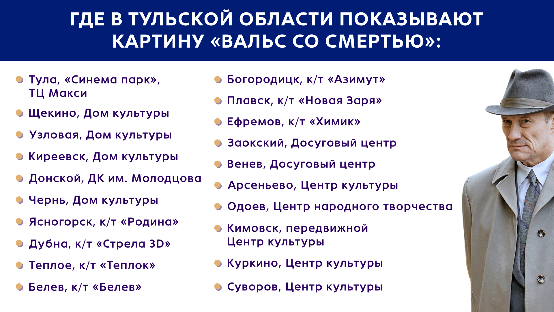В Туле картину можно увидеть в "Синема Парк" в "Макси". По всей Тульской области "Вальс со смертью" покажут в 19 кинотеатрах.