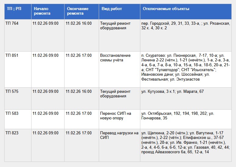 Часть Тулы останется без света 11 февраля. Об этом сообщают «Тульские городские электрические сети».