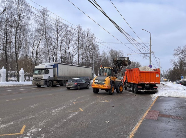 Снег с помощью лапового погрузчика вывозили на Рязанском мосту, проспекте Ленина, Щекинском шоссе.