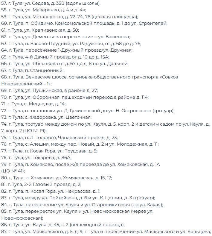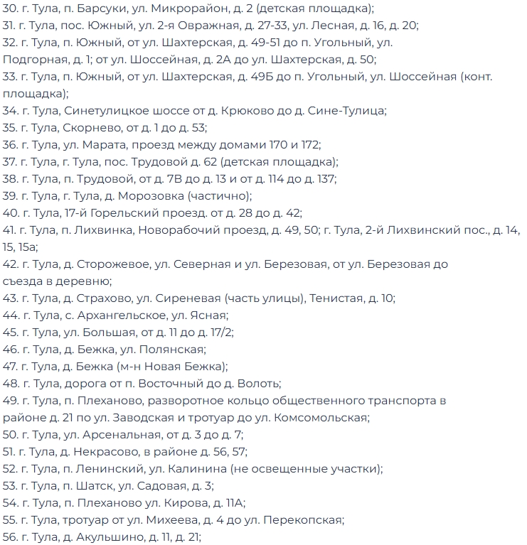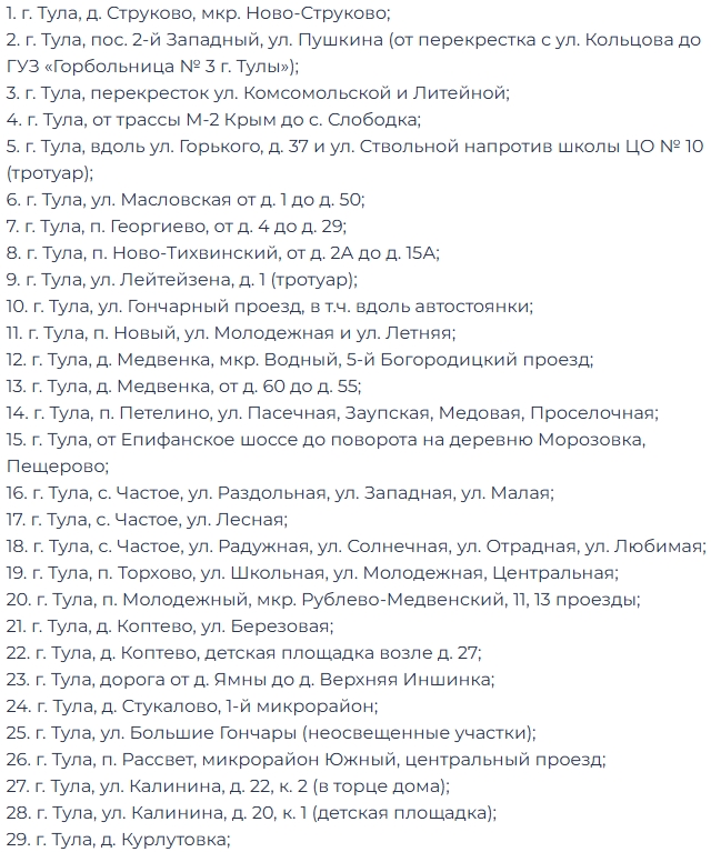 Список адресов, где будут проводиться работы, сформировали с учетом обращений жителей по поручению главы Администрации Ильи Беспалова. Работы выполняются за внебюджетные средства силами МБУ «Тулагорсвет».