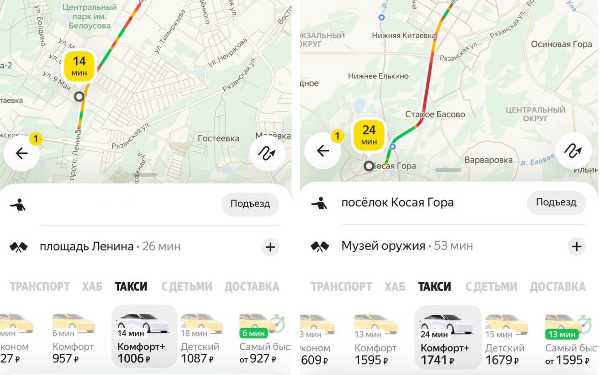Уехать с улицы 9 мая до площади Ленина можно за тысячу рублей, а добрать из поселка Косая Гора в Заречье обойдется в почти две тысячи рублей.