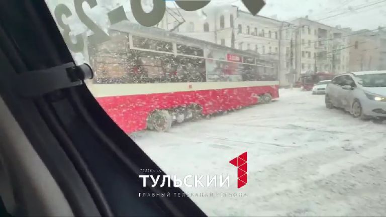 Не пощадила погода и общественный транспорт – в Туле трамвай пошел вразрез из-за снега на дороге.