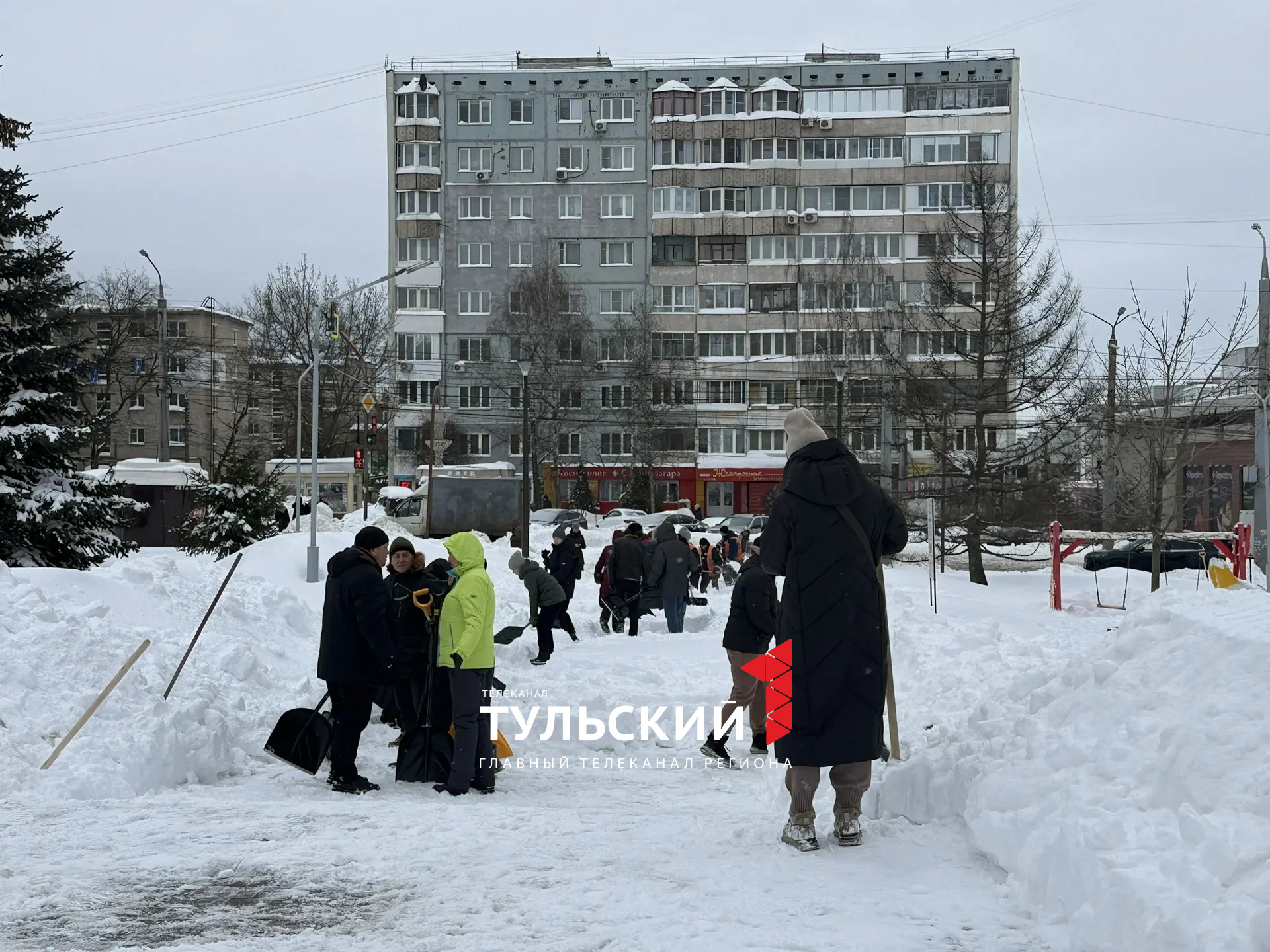 Убирать от снега сквер на улице Октябрьской в Туле утром 21 февраля вышли сотрудники городской администрации, активисты "Молодой гвардии" и просто неравнодушные туляки.