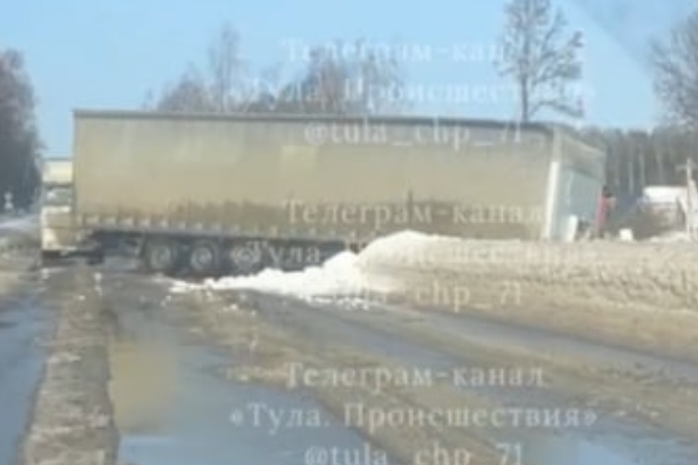 Фуру развернуло поперек дороги в Тульской области. Кадры с места происшествия публикуют в соцсетях.