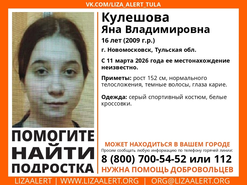 О местонахождении 16-летней Яны Владимировны Кулешовой ничего не известно с 11 марта. Девочка может находиться в вашем городе.