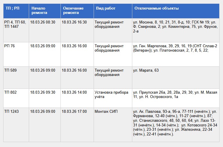Света не будет с 09:00 до 17:00 из-за капитального ремонта электрооборудования, установки прибора учета и монтажа СИП.