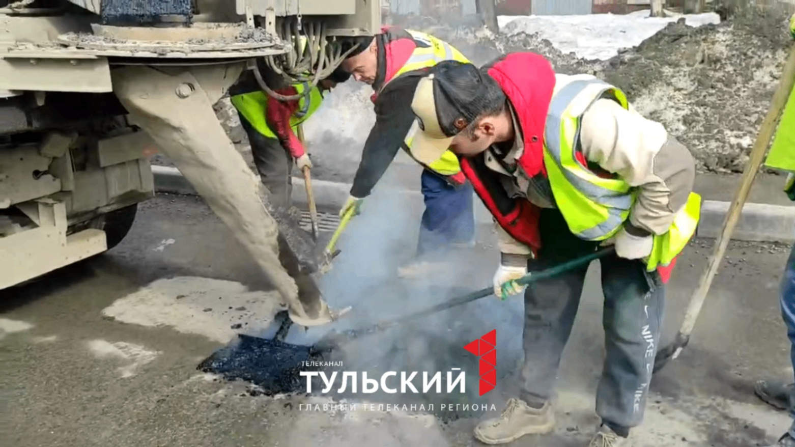 Ямы заделывают так называемым литым асфальтом. Готовую смесь привозят в специальных резервуарах, благодаря чему она остается горячей. По технологии ее температура гораздо выше, чем у обычной асфальтовой смеси. Именно это позволяет использовать литой асфальт в межсезонье — когда холодно и кругом лужи.