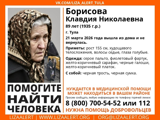 Борисова Клавдия Николевна, 89 лет. 21 марта 2026 года вышла из дома и не вернулась.