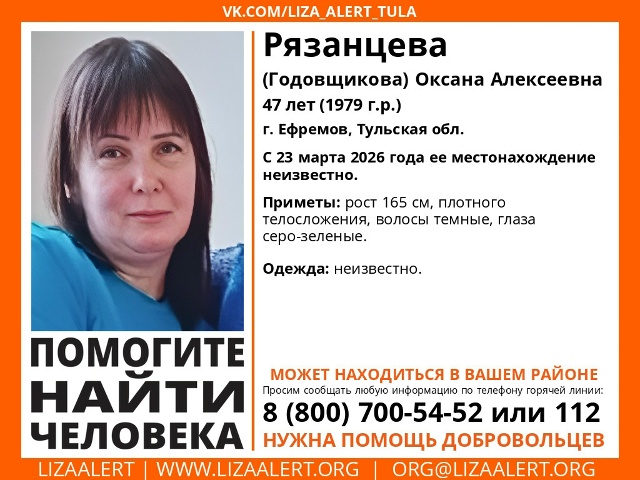 В Ефремове ищут 47-летнюю Оксану Алексеевну Рязанцеву. Об этом сообщает поисковый отряд "ЛизаАлерт".