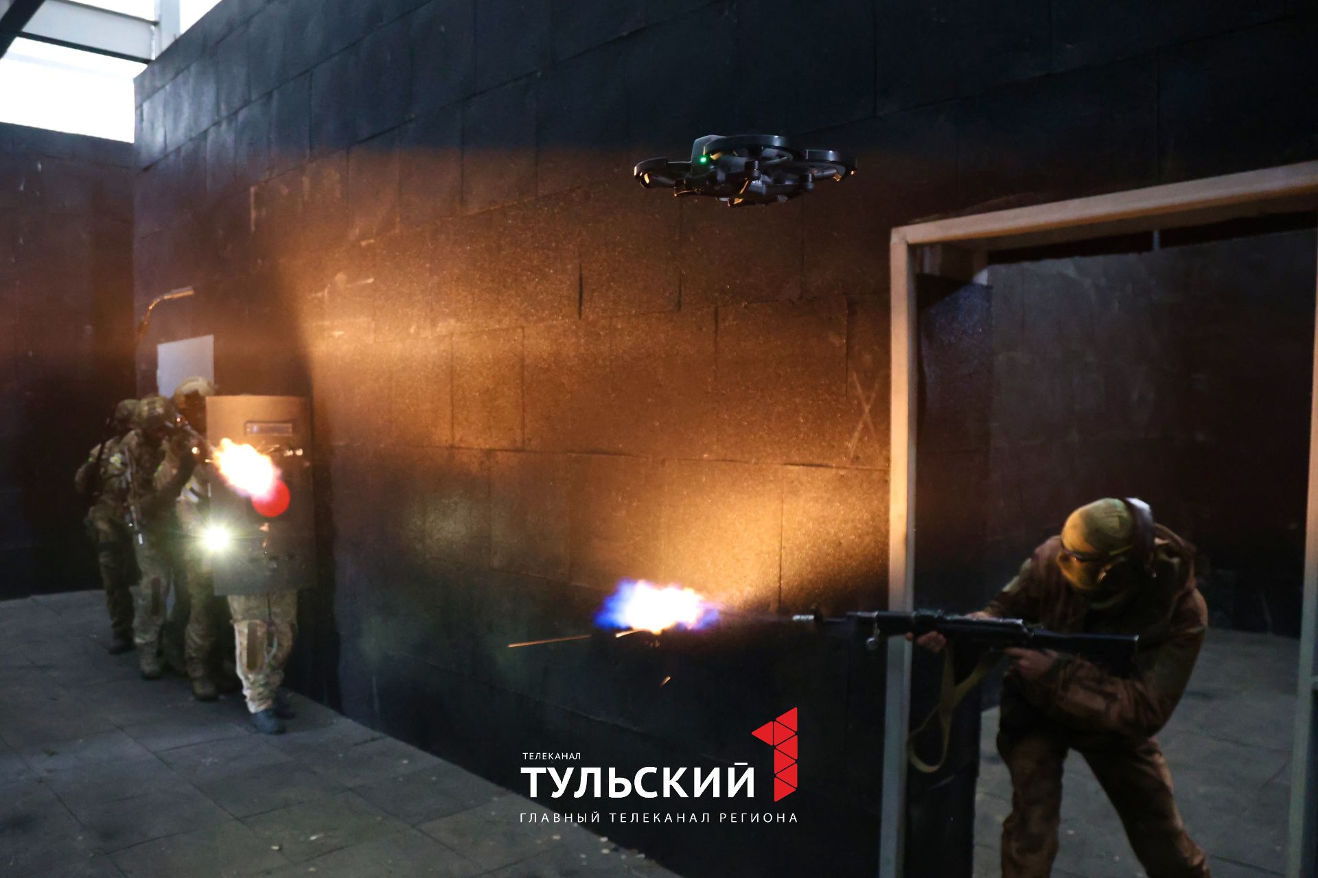 Учение спецотряда быстрого реагирования СОБР «Буран» провели на полигоне под Тулой. По легенде, боевик укрылся в большом промышленном здании. Его точную локацию определил разведывательный дрон. Специальный миниатюрный коптер идеален для замкнутого пространства.