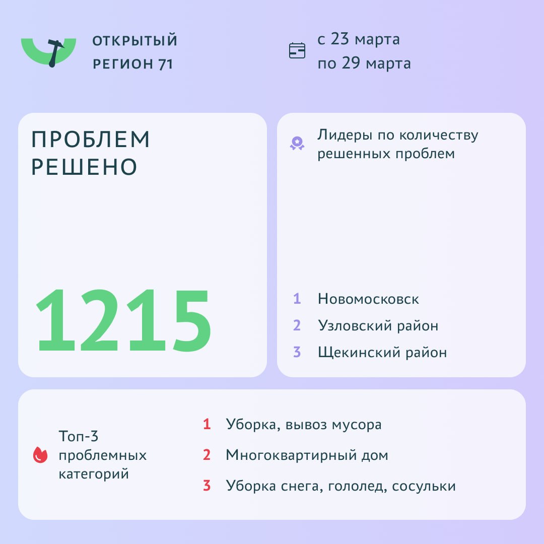 Самыми популярными категориями стали уборка и вывоз мусора. Районами-лидерами по количеству решенных проблем стали Новомосковск, Узловский и Щекинский районы.