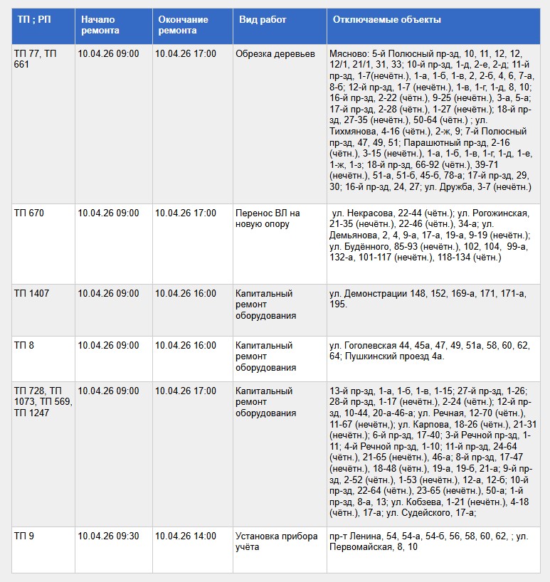 Света не будет с 09:00 до 17:00 из-за капитального ремонта электрооборудования, установки прибора учета и обрезки деревьев.