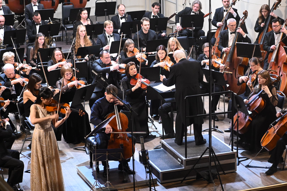 Вместе с оркестром на сцену вышли лауреаты международных конкурсов - скрипачка Яна Белоусова и виолончелист Владислав Белоусов.