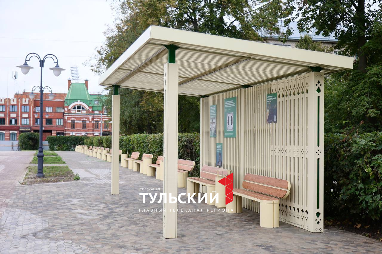 Беседки в обновленном сквере выполнены в стиле террасы дома Толстых в Ясной Поляне. В них развесили плакаты с цитатами из романов писателя и QR-код. Перейдя по нему можно послушать музыку, которую мог слушать сам Лев Толстой.