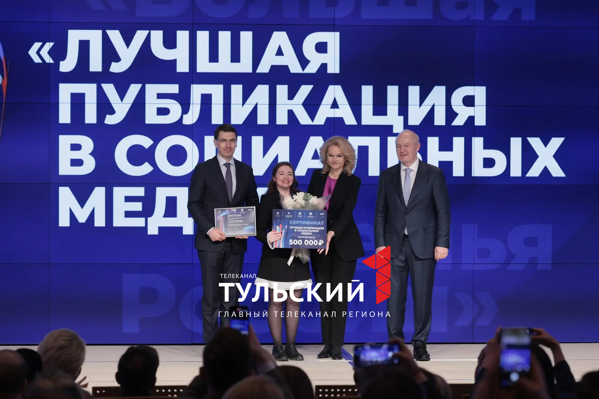 Диплом победителя, статуэтку и сертификат Галине вручили Зампред Правительства России Татьяна Голикова, Полномочный представитель Президента России в ЦФО Игорь Щёголев и генеральный директор "ТАСС" Андрей Кондрашов.
