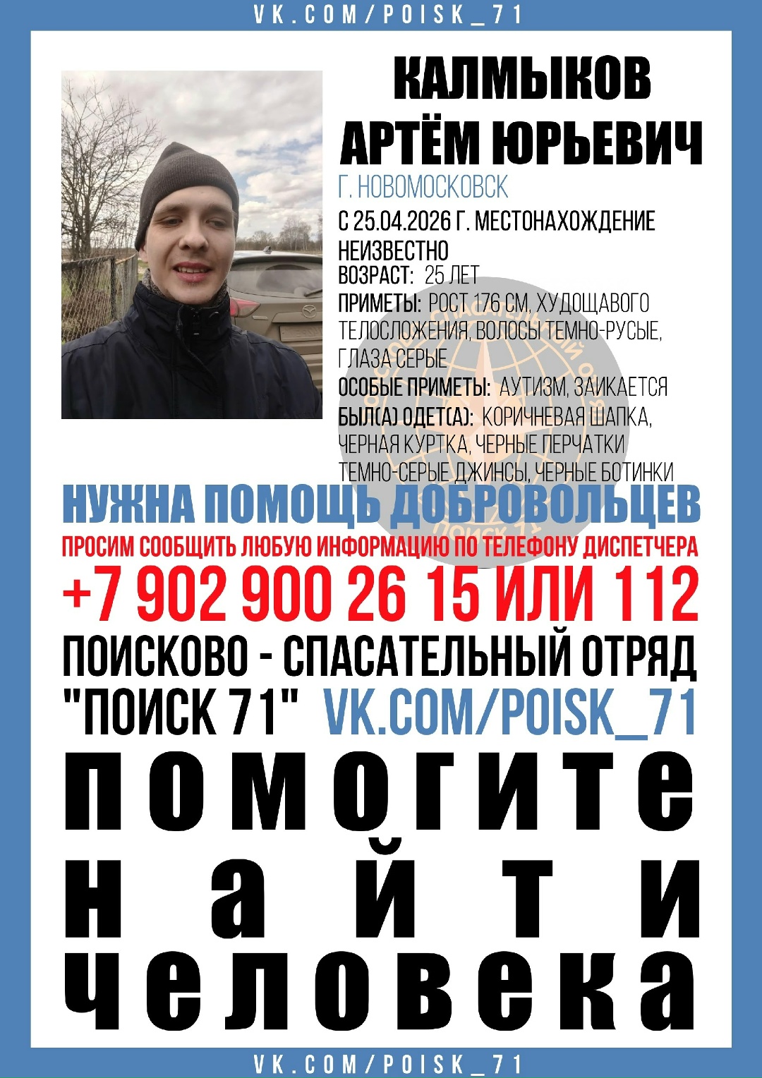 Если вам известно что-либо о местонахождении этого человека, пожалуйста, позвоните по номеру 112 или свяжитесь с диспетчером поисково-спасательного отряда "Поиск 71" по телефону - 8-902-900-26-15.