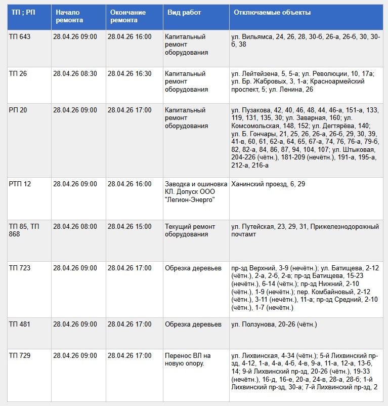Полный список адресов и график отключений представлены ниже: