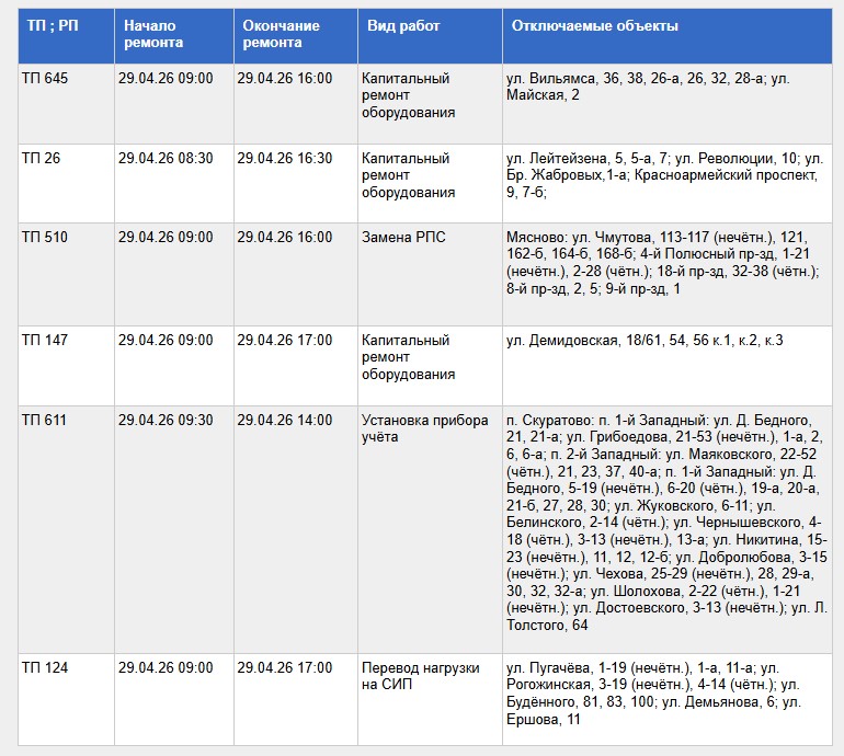 Полный список адресов и график отключений представлены ниже: